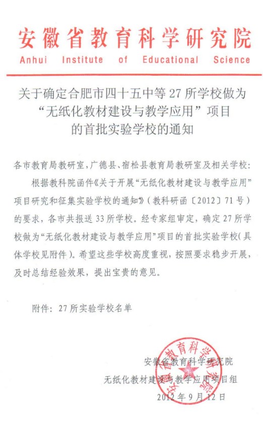 合肥45中确定为无纸化教材项目首批实验学校 合肥四十五中网站 2012-09-27 09:17:58 合肥奥数网讯:关于确定合肥四十五中等27所学校做为“无纸化教材建设与教学应用”项目的首批实验学校的通知:(合肥四十五中张金苗老师对话央视) >>>相关推荐 合肥市庐阳区重点中学最新信息汇总 合肥市重点中学小升初信息聚集地