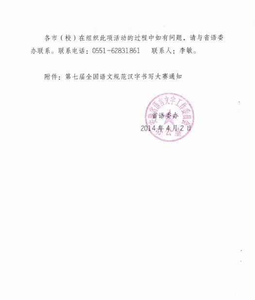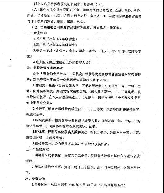 一、各县(市)区根据实际情况,本着自愿的原则,按照皖教语函〔2014〕7号文件要求,组织辖区单位参加活动,并在规定的6月30日前完成第七届全国规范汉字书写大赛书法作品的报送工作。