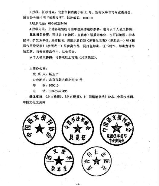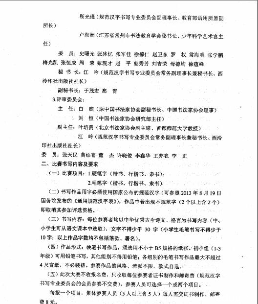二、合肥市教育系统第八届规范汉字书写比赛作品征集活动即日起同步进行。凡报送参加全国大赛的作品,也书写一份同样内容的作品参加市级比赛。市级奖项设置将根据作品的数量和质量由评审专家确定。市级参赛作品由各县(市)区语委办汇总后,于7月上旬报送市语委办,市管学校直接报送。