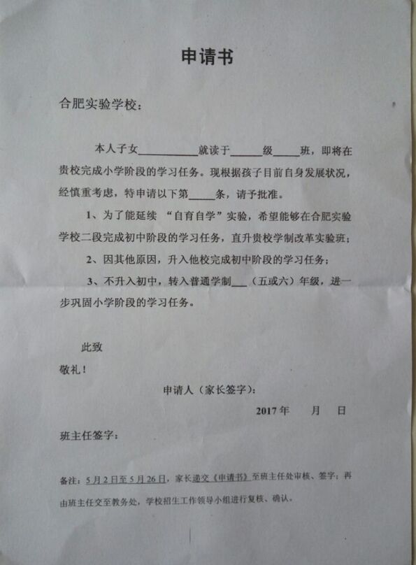 2017年合肥实验学校小升初申请表格