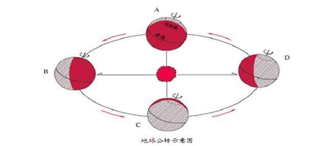 当转到位置D时,北半球阳光斜射,是冬季;南半球阳光直射,是夏季。