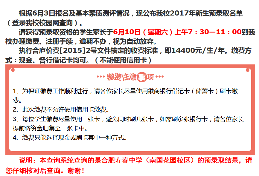 2017年合肥南国寿春小升初招生预录取查询系统