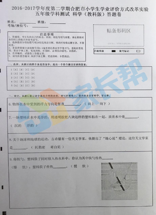 2017年合肥市学业水平测试五年级科学试卷(3)
