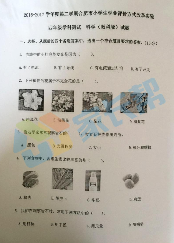 2017年合肥市学业水平测试四年级科学试卷