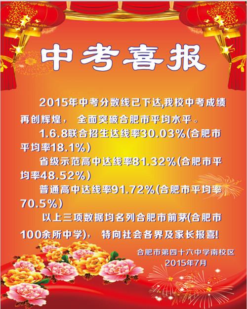 2015年合肥四十六中南区中考喜报 合肥家长帮 2017-06-26 14:02:23 20115年合肥四十六中南区中考喜报 编辑推荐: 合肥四十六中校园图片 2017年合肥四十六中学南校区小升初报名须知