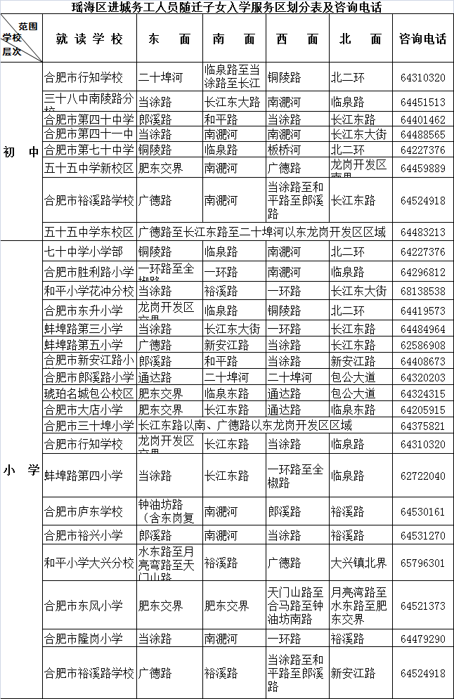 2017年合肥瑶海区随迁子女接收学校和电话。积极稳妥地做好随迁子女入学工作,保障符合政策条件的随迁子女接受义务教育。根据区域实际情况,7月8日前公布接收随迁子女学校名单。7月12日-7月16日随迁子女根据暂住区域到相应的学校报名,7月26日-7月28日随迁子女入学补报名。随迁子女入学须提供以下材料: