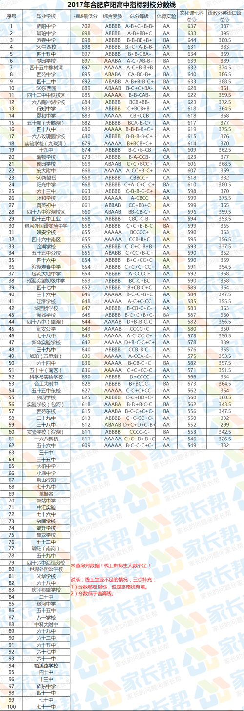 下面是2017合肥各初中合肥庐阳高中指标到校分数线汇总,欢迎大家查看!