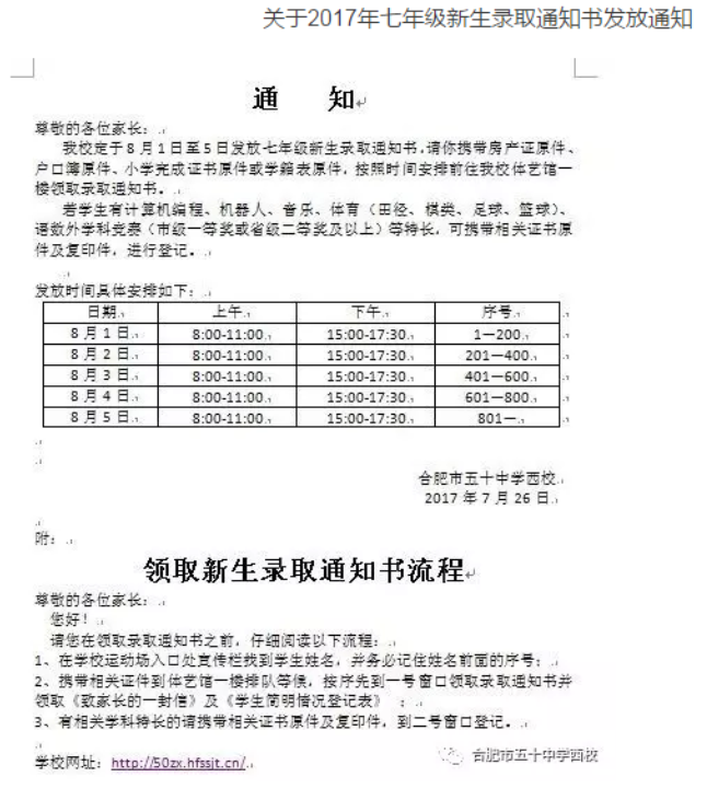 2017年合肥五十中西区小升初录取通知书领取通知 合肥家长帮 2017-07-27 15:46:41 2017年合肥五十中西区小升初录取通知书领取通知已经发放,下面是详细情况,欢迎大家查看! 编辑推荐: 2017合肥48中小升初还未办理报名手续的家长注意啦! 2017合肥各中学小升初军训及分班考试时间汇总