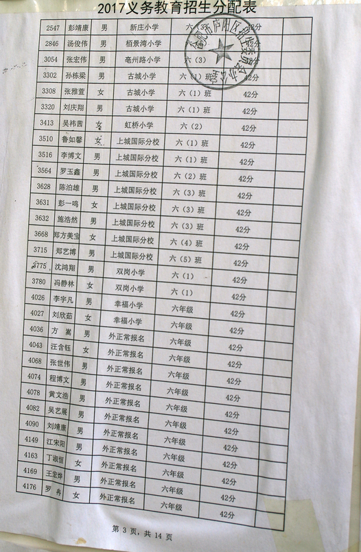 2017年合肥四十二中中铁校区小升初新生名单(4)