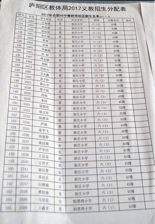 2017年合肥四十五中橡树湾小升初新生名单(5)
