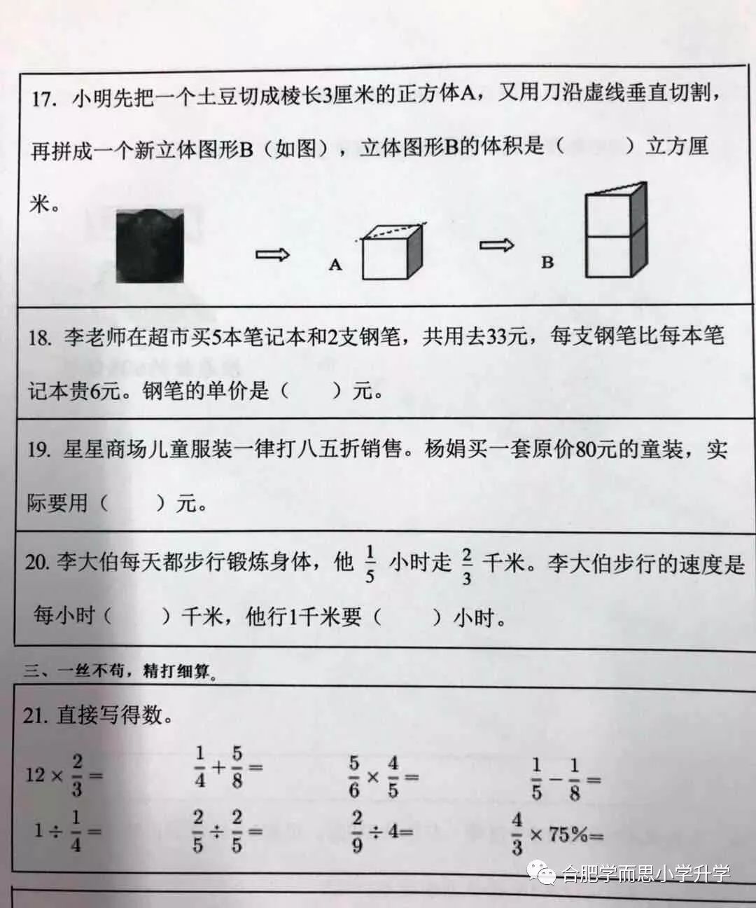 2017-2018合肥六年级上学期学业水平测试数学试卷(4)