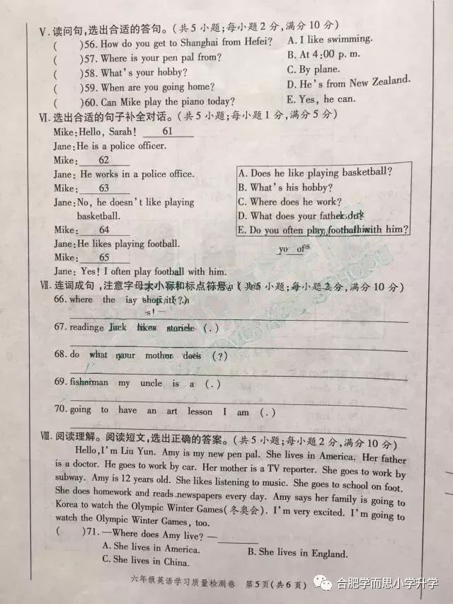 2018年合肥瑶海区六年级调研考试英语试卷(2.28)(5)