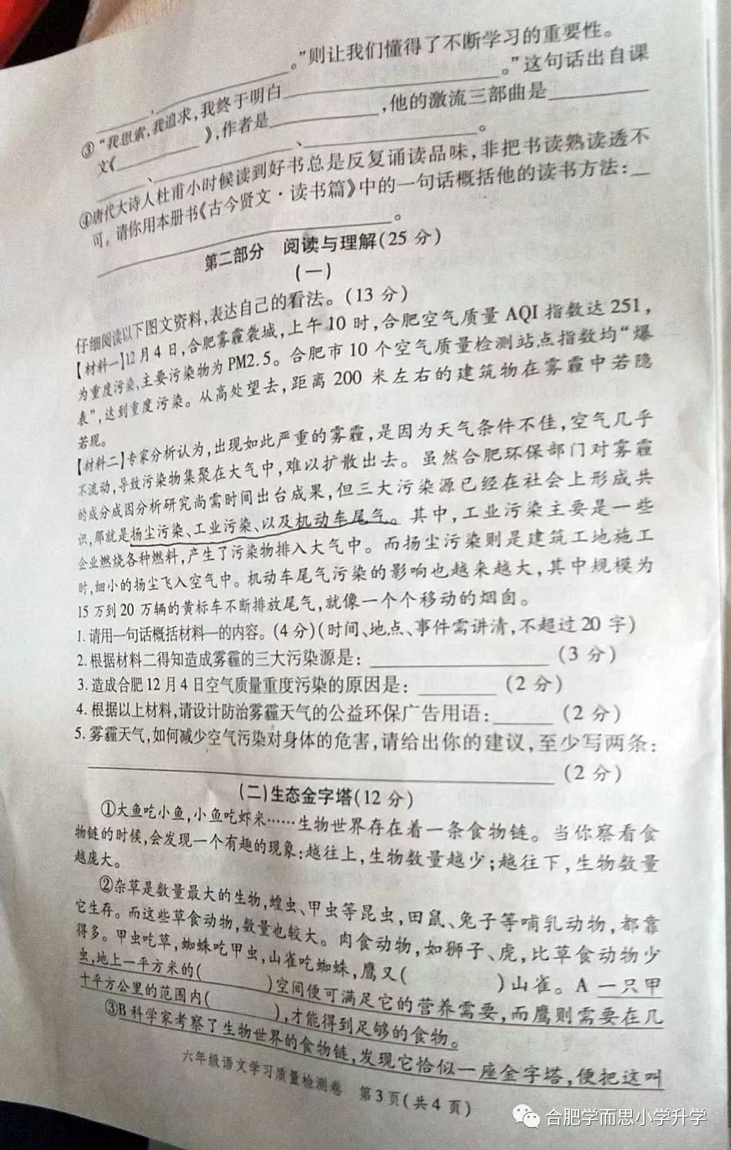 2018年合肥瑶海区六年级调研考试语文试卷(2.28)(3)