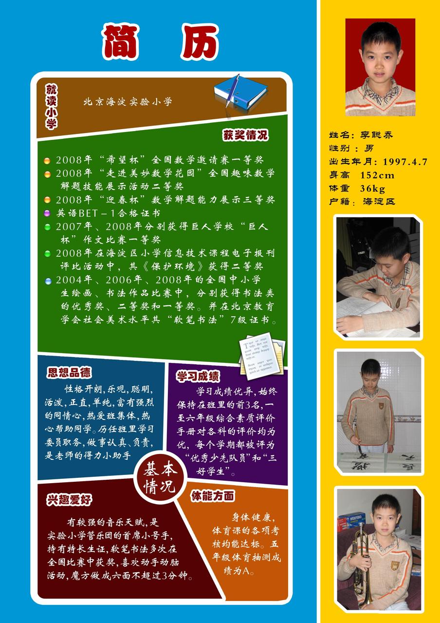 此页重点针对老师感兴趣的内容做简单介绍,目的是为了让老师能很容易地对学生产生一个初步的印象,如果直接是洋洋洒洒的文字,老师在众多的简历中想是没兴趣看下去。家长的电话也要留在此页上,这很重要!嘿嘿,在这里我暂且换了一张照片。