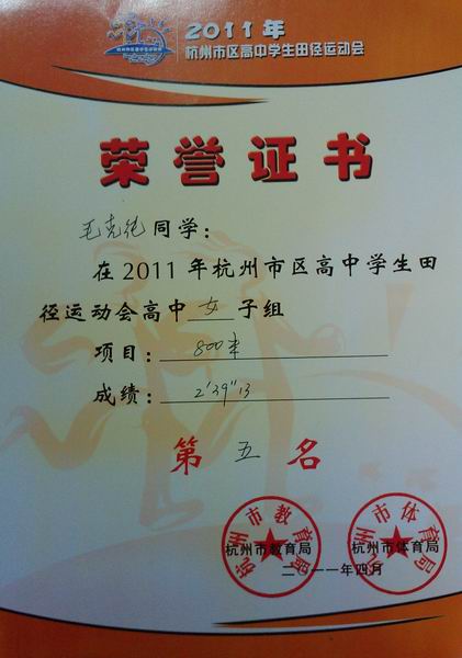 4月21—22日,由杭州市教育局、杭州市体育局主办的杭州市高中学生田径运动会在杭州市体育中心田径场举行。我校3名同学组队参加了比赛。经过了激烈的角逐,我校毛克纯同学参加的高中女子800米,荣获决赛第五名,成绩为:2'39''13,同时破我校2'46''29记录;毛克纯参加的高中女子400米,预赛第十,无缘进入决赛,成绩为1'07''84,破我校1'08''9记录。刘润树同学参加的高中男子400米,预赛第十,无缘进入决赛,成绩为53''42,破我校55''9记录;刘润树参加的高中男子100米,预赛第18名,成绩为12'03。以上成绩均为电动计时。另外,王小语同学参加了高中女子铁饼的比赛,预赛排名第17,无缘决赛,成绩为15.53米。 |