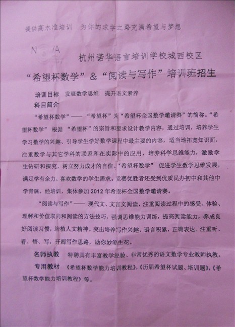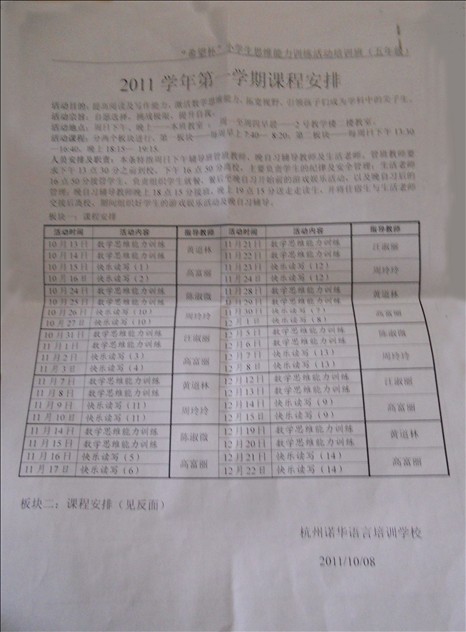 而更令人震惊的是:据学生家长透露为学生补课的语文老师竟然是采荷第三小学的副校长王XX女士,数学老师则是采荷第三小学的数学老师徐X。王XX曾是孙XX在采三当校长时的校长助理。据金成求是小学学生家长透露,这位这学期新上任的孙XX校长一来到学校不到一个月就给五六年级开家长会,并向家长提出要开办补习班,当时说的是找一个叫做“诺华语言培训学校”的社会培训机构为学生提供补课,而补习地点就设在金成求是小学内,而要进这个补习班就得交1200元的补课费,为此只有一部分学生家长(两个班大概30人左右)为自己的孩子报了名并交了1200元钱,学校方面说是找优秀老师来校给学生上课,从10月12日开始每礼拜天下午13:30—16:40补课,共补10天,可是学校给家长的一份补课安排表上却写的是本校老师,也就是五六年级的语文和数学老师,这个让家长有些疑惑,然而有细心的家长在周末接送孩子的时候发现为学生补课的语文老师竟然是采荷第三小学的副校长王XX女士,补课的数学老师则是采荷第三小学的数学老师徐X。