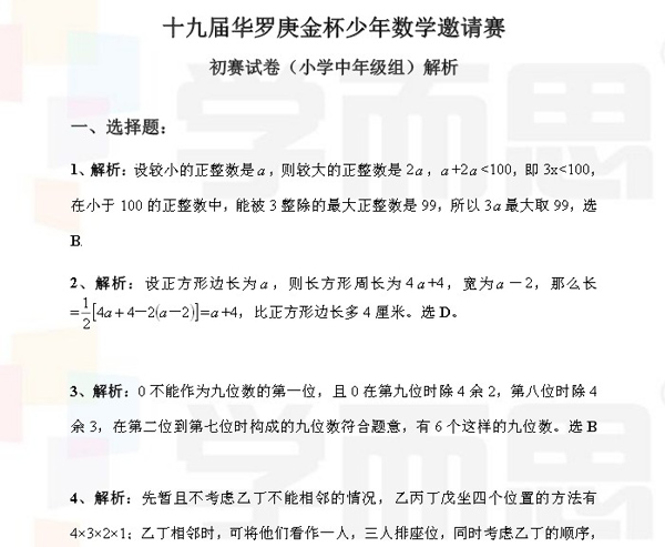 第十九届华杯赛初赛(小中组)试题及解析(2) 杭州奥数网 2014-03-15 20:11:25 第十九届华杯赛初赛试题-解析(小学中年级组) 请下载附件: 第十九届华杯赛初赛(小学中年级组)试题解析 (本地下载) 点击进入论坛参与讨论: 第十九届2014年华杯赛试题及详细答案解析版 首页 上一页 下一页 尾页