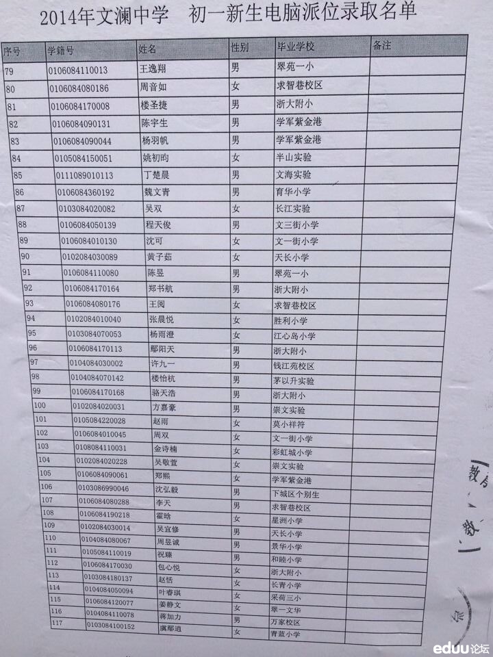 小升初:2014杭州文澜中学电脑派位名单(3)