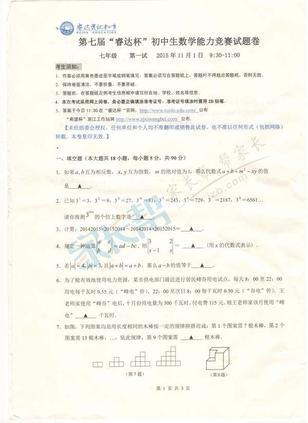 2015年第七届睿达杯杭州一试七年级数学试题 杭州奥数网 2015-11-10 15:16:39 杭州奥数网:2015年11月1号2015年第七届睿达杯杭州赛区进行了睿达杯的一试,小编将睿达杯数学试题整理汇总如下。 推荐阅读:2015年第七届睿达杯杭州一试语数英试题及答案 睿达杯七年级试题 首页 上一页 下一页 尾页