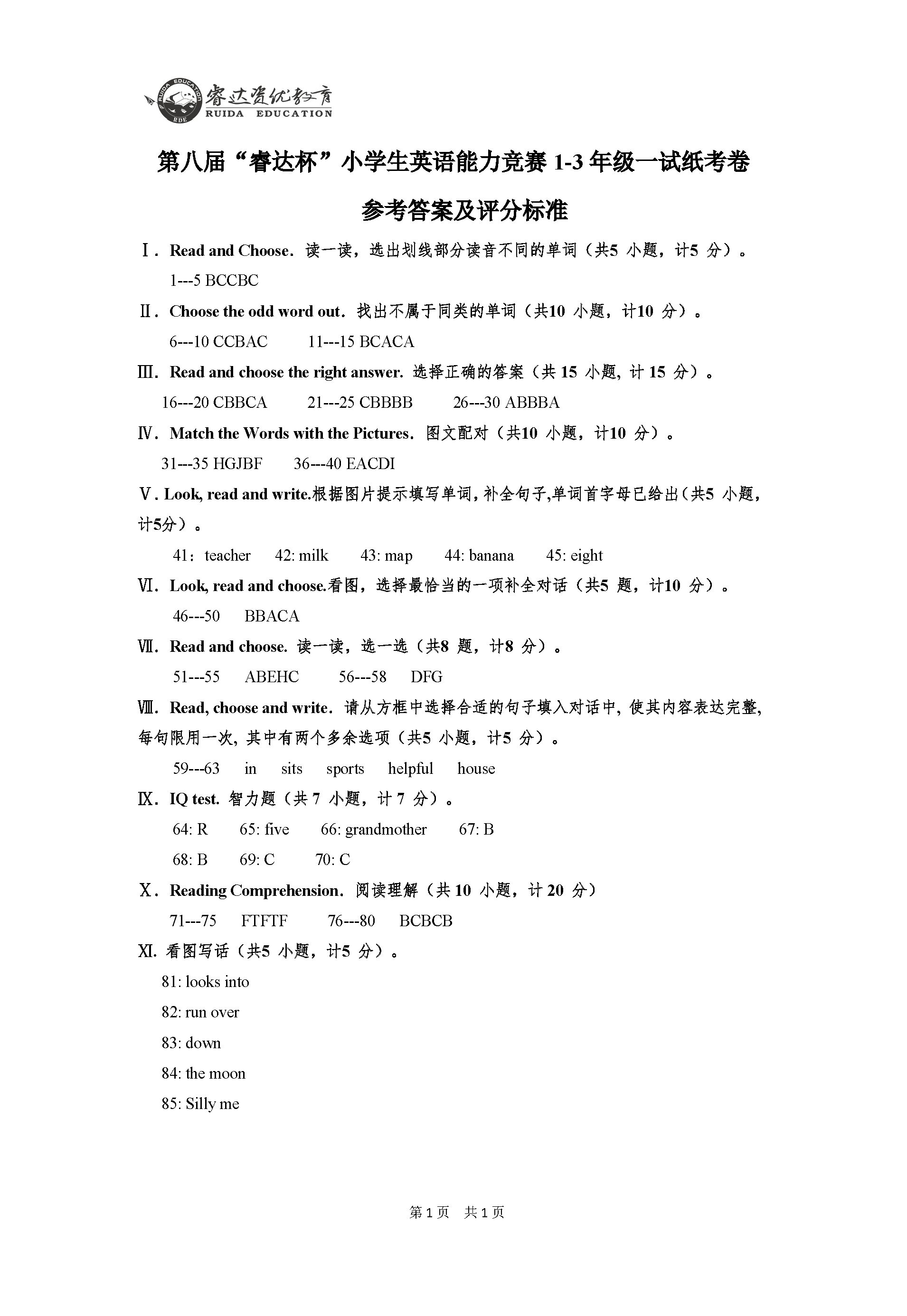 2017年杭州第八届睿达杯一试三年级答案(英语)