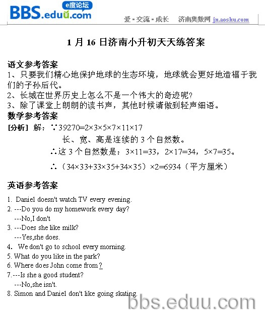 2012.1.16济南小升初天天练模拟题答案