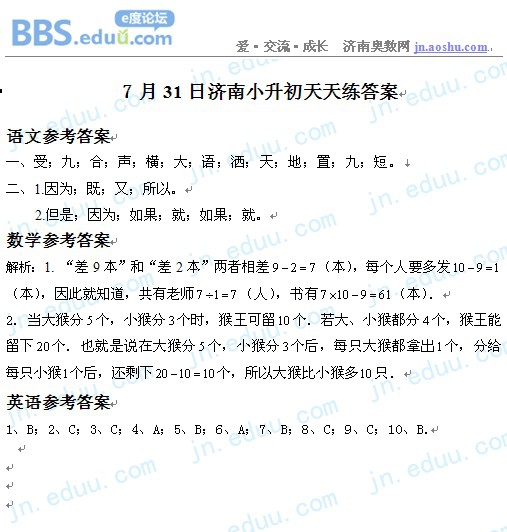 2012.7.31济南小升初天天练模拟题答案