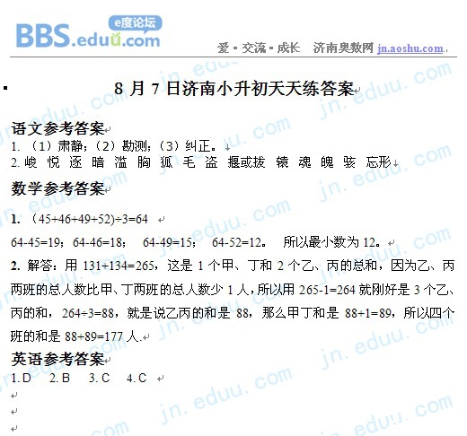 2012.8.7济南小升初天天练模拟题答案