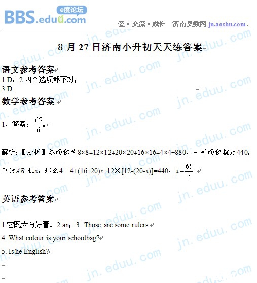 2012.8.27济南小升初天天练模拟题答案