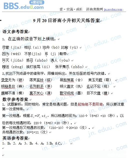 2012.9.20济南小升初天天练模拟题答案