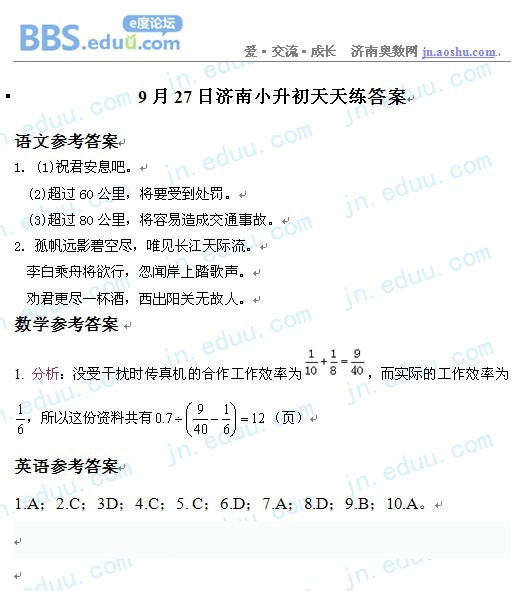 2012.9.27济南小升初天天练模拟题答案