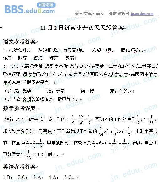2012.11.2济南小升初天天练模拟题答案
