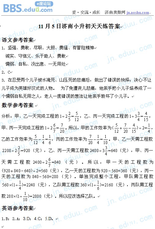 济南小升初天天练栏目每日精选一道题,由济南e度论坛老师指导讲解,为济南小升初的孩子升学把脉。本套小升初模拟试题帮六年级学生巩固小学知识点,为重点中学招生考试、小学结业考试保驾护航。下面是此套小升初模拟试题语文、数学、英语三部分的答案解析。