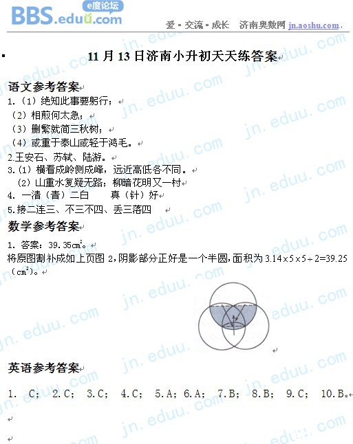 济南小升初天天练栏目每日精选一道题,由济南e度论坛老师指导讲解,为济南小升初的孩子升学把脉。本套小升初模拟试题帮六年级学生巩固小学知识点,为重点中学招生考试、小学结业考试保驾护航。下面是此套小升初模拟试题语文、数学、英语三部分的答案解析。