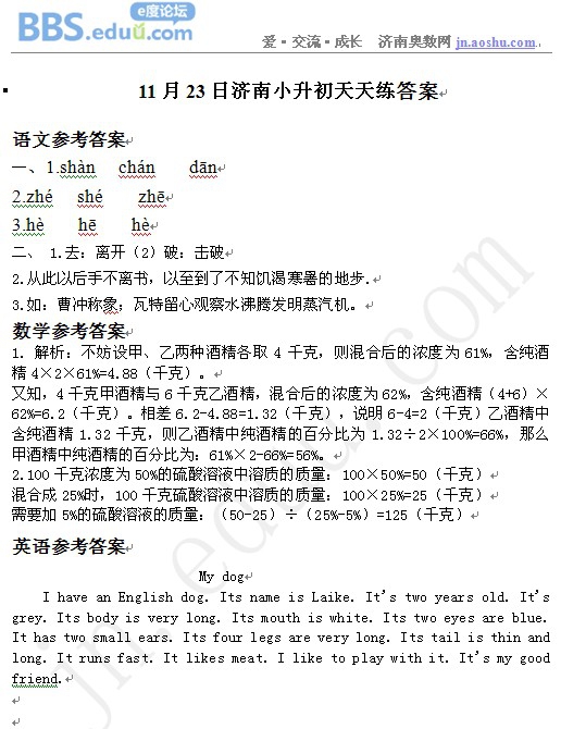 济南小升初天天练栏目每日精选一道题,由济南e度论坛老师指导讲解,为济南小升初的孩子升学把脉。本套小升初模拟试题帮六年级学生巩固小学知识点,为重点中学招生考试、小学结业考试保驾护航。下面是此套小升初模拟试题语文、数学、英语三部分的答案解析。