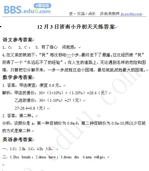 2012年12月3日济南小升初天天练模拟题答案