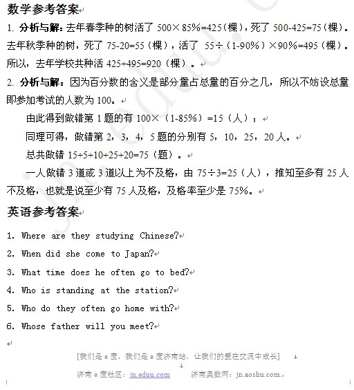济南小升初天天练栏目每日精选一道题,由济南e度论坛老师指导讲解,为济南小升初的孩子升学把脉。本套小升初模拟试题帮六年级学生巩固小学知识点,为重点中学招生考试、小学结业考试保驾护航。下面是此套小升初模拟试题语文、数学、英语三部分的答案解析。