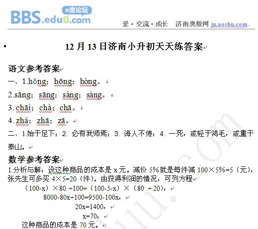 2012年12月13日济南小升初天天练模拟题答案