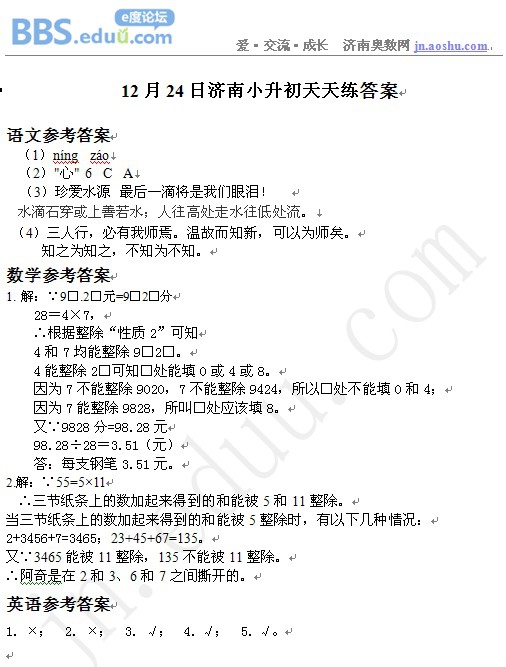 2012年12月24日济南小升初天天练模拟题答案