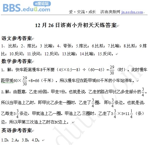 2012年12月26日济南小升初天天练模拟题答案