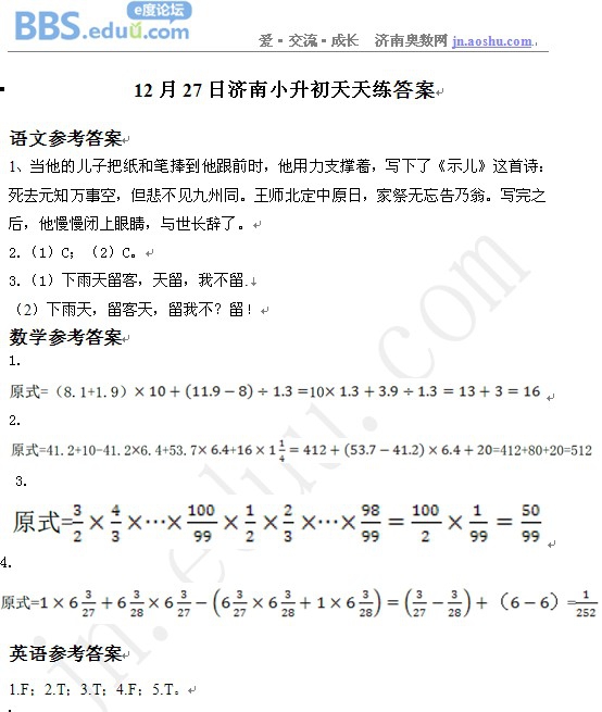 2012年12月27日济南小升初天天练模拟题答案