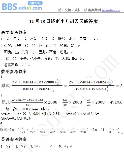 2012年12月28日济南小升初天天练模拟题答案