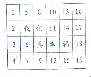 4.从下面19个有编号的正方形中选出一个正方形,与写有"我们真幸福"字样的五个正方形折成一个正方体纸盒,一共有_____种不同的选法,分别选择编号是_______的正方形。