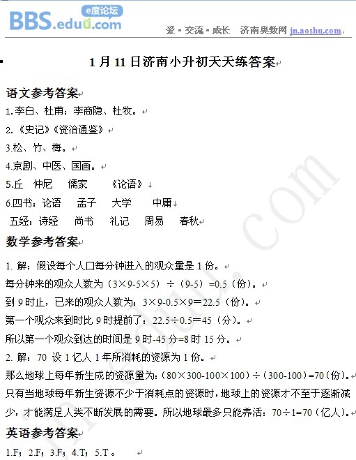 2013年1月11日济南小升初天天练模拟题答案