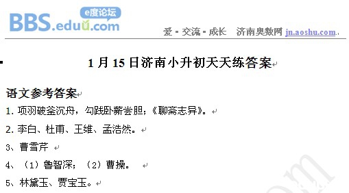 济南小升初天天练栏目每日精选一道题,由济南e度论坛老师指导讲解,为济南小升初的孩子升学把脉。本套小升初模拟试题帮六年级学生巩固小学知识点,为重点中学招生考试、小学结业考试保驾护航。下面是此套小升初模拟试题语文、数学、英语三部分的答案解析。