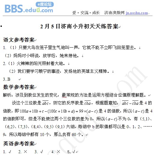 2013年2月5日济南小升初天天练模拟题答案