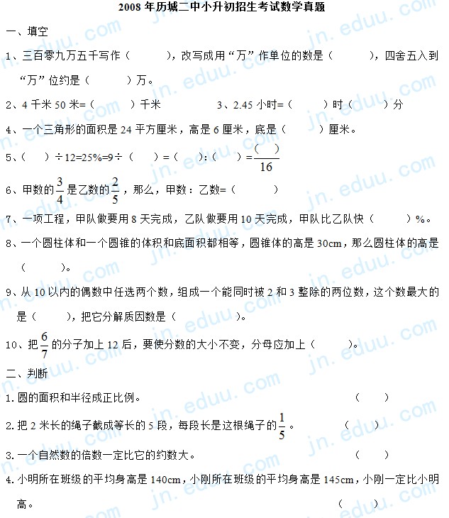 2008年历城二中小升初考试数学试卷及答案 济南奥数网整理 2013-02-16 17:01:04 济南奥数网免费提供济南历城二中初中部(稼轩中学)2008年小升初考试数学试卷及答案解析。 2008年稼轩中学小升初考试数学试卷 首页 上一页 下一页 尾页