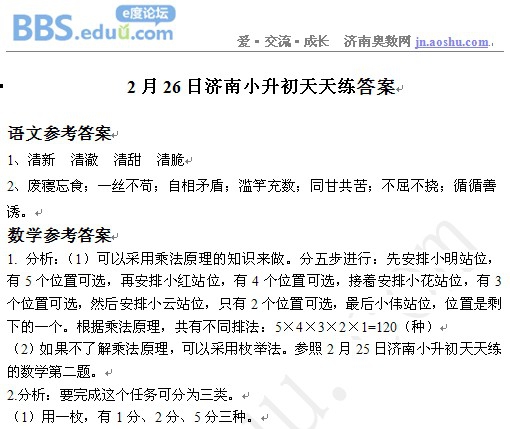 2013年2月26日济南小升初天天练模拟题答案
