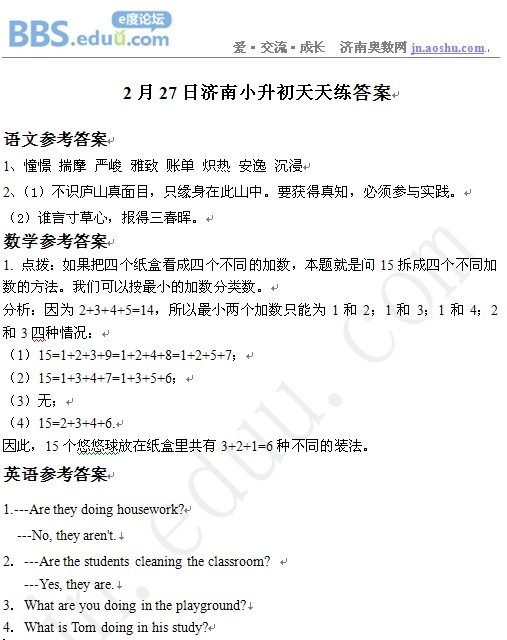 2013年2月27日济南小升初天天练模拟题答案