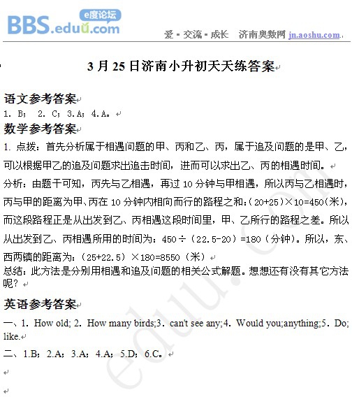 小升初模拟题的问题及现场解答可以到济南e度论坛小升初板块里查看,帖子里是为2013年小升初准备的试题训练,点击前往小升初天天练汇总贴。