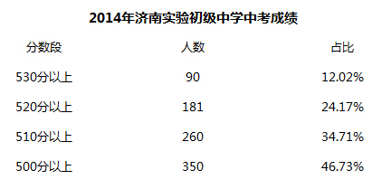 济南实验初中在历年的中考中,升入省重点高中的比例居全区第一、全市前列。2014年济南实验初中的中考成绩,跟育英不相上下。今年实验初中的初中毕业生有749人。每班50多个人。具体成绩如下。